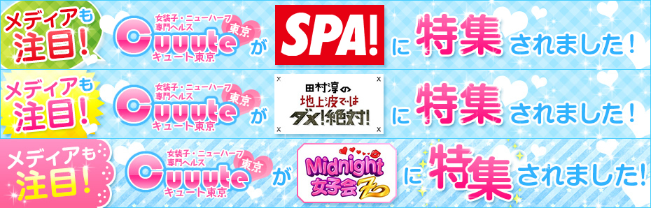 | Cuuuteの待遇 | 報酬は業界水準より高めに設定することでキャストのやる気を引き出します。 完全日払い・リピートバックあり・オプションフルバック 未経験の方でも安心できるプロのヘアメイクによるメイク講習をご用意 派閥など面倒な人間関係も一切無い安心な待機スペースをご用意 ワンランク上を目指す方にはメディア出演への後押しも可能 接客指導やキャストに合った接客方法などの教育環境もバッチリです |